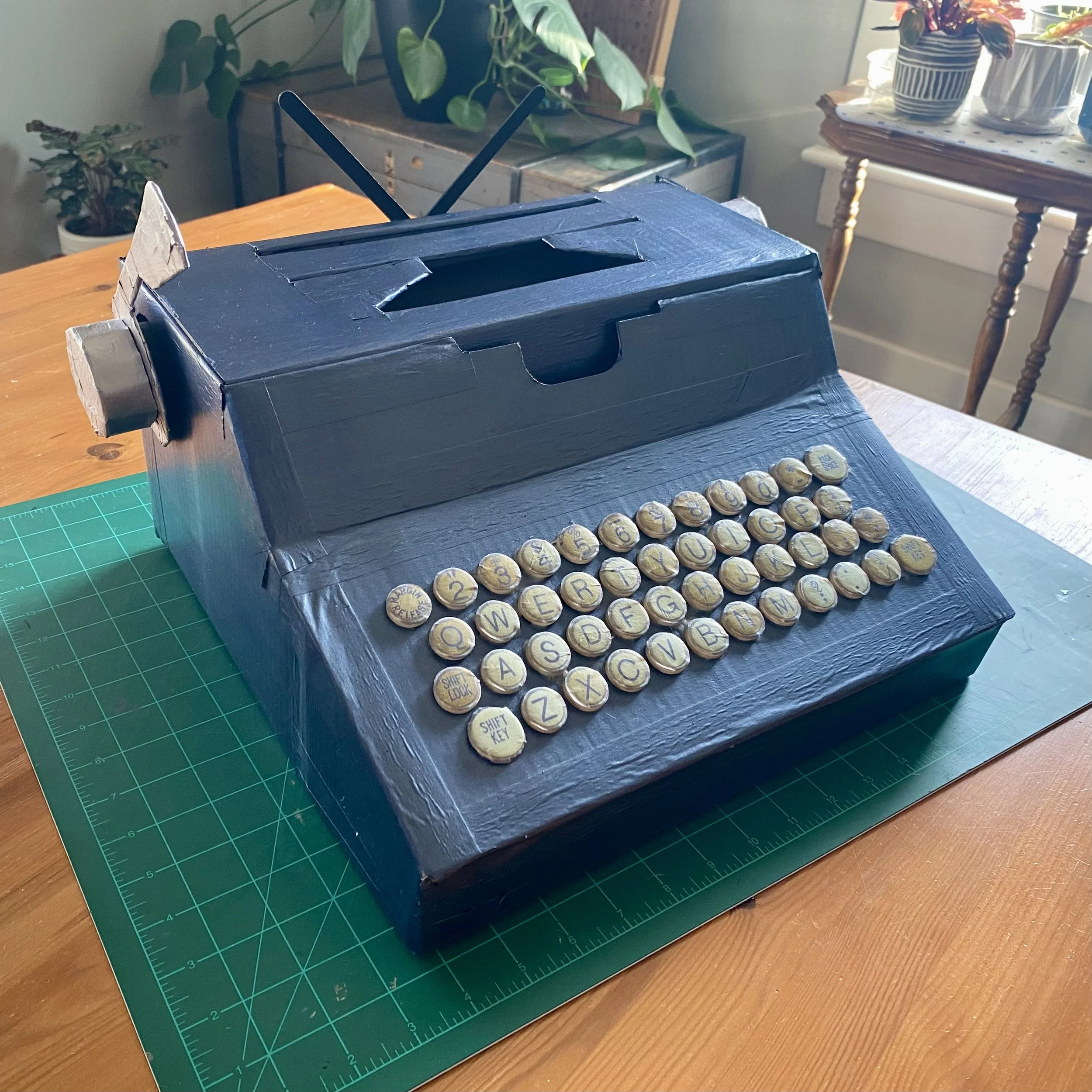The “keys” got a little wrinkled (we glued letters onto buttons then mod-podged them) but overall I think it’s recognizable as a typewriter.